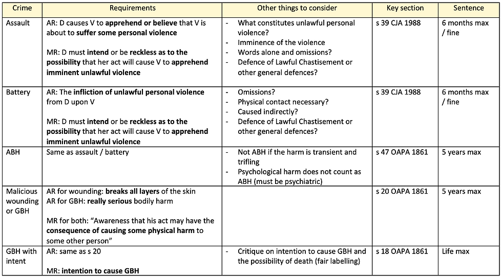 During undergrad I made a table to summarise non-fatal offences, the table really helped me visualise what to touch on in my exam answers so I am sharing it here.